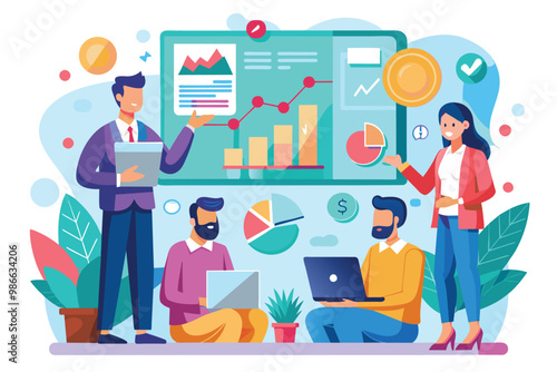 Vector illustration of big light bulb and office people team discussing new business project, analysing statistical graphs. New ideas, brainstorming, teamwork, effective team collaboration concepts.