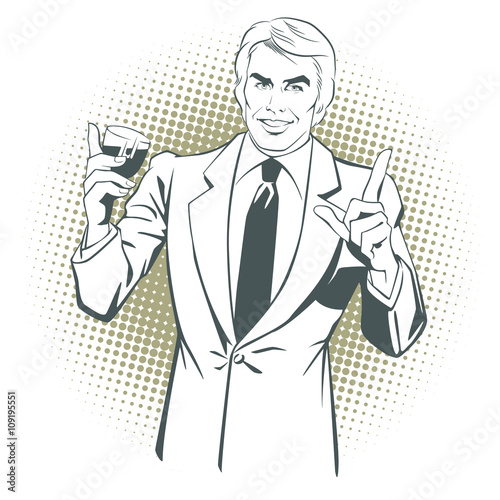 Business man with glass of champagne celebrates closed deal. Cheers and party concept vector illustration in retro pop art comic style.