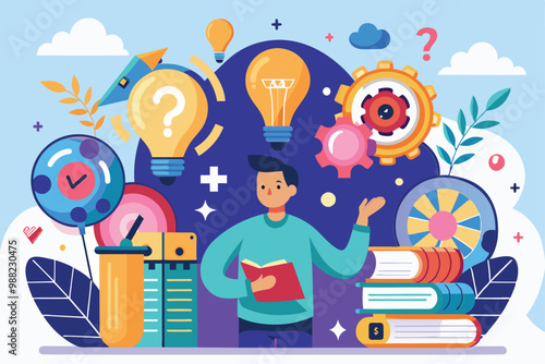 Business man works with laptop in the office. Hand drawn business concept vector illustration. Financial analyst works on computer with charts, emails, diagrams. Business strategy planning.