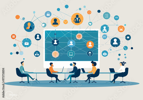 Business meeting concept vector illustration. Businessman makes presentation of new business strategy. Agile team work in office with analytics data board.