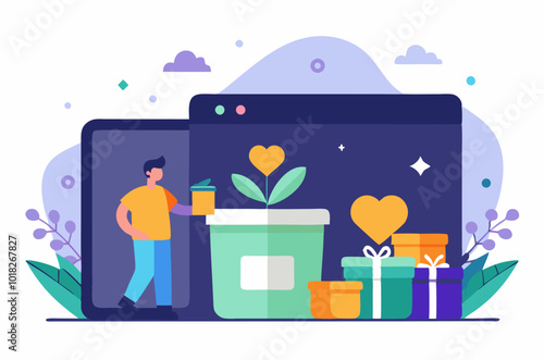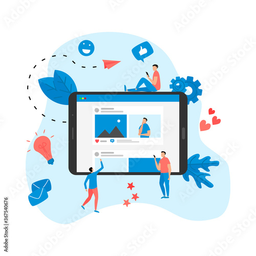 Vector illustration of office people woman working on laptop while sitting on big computer and man looking through binoculars while standing on bar graph. Business metaphorical concept for web banner.