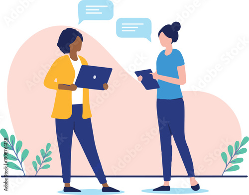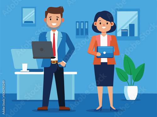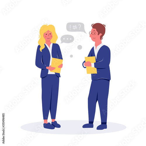 Vector illustration of businesswoman giving briefcase full of paper money to businessman. Business people flat style design elements, icons isolated on white background.