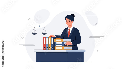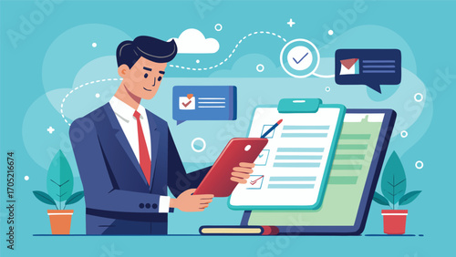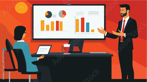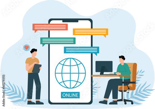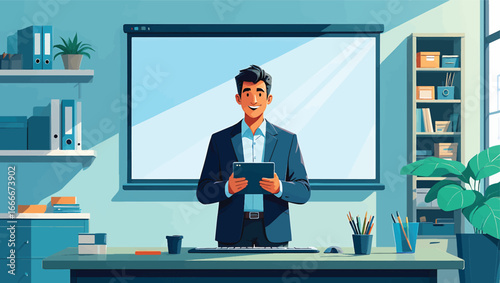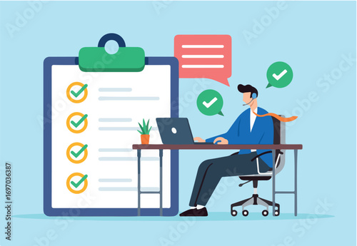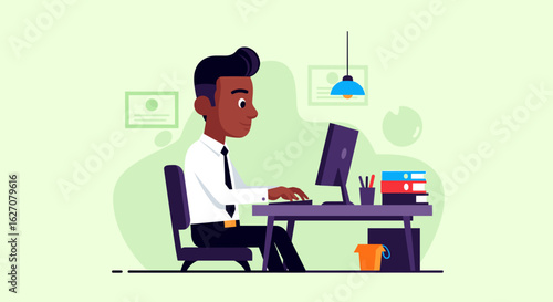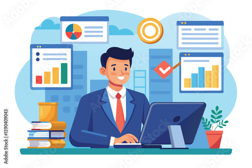 Vector illustration of happy office worker male sitting at office desk and using laptop. Business people flat style design element, icon isolated on white background.