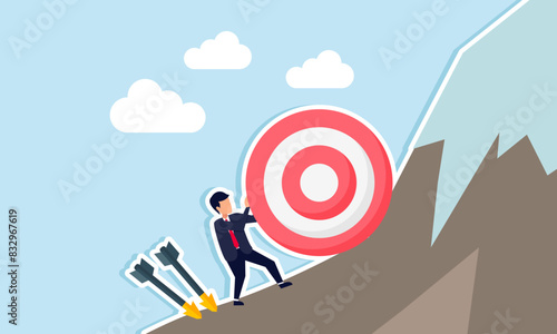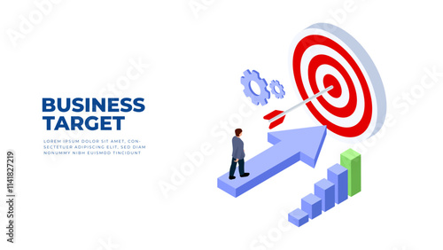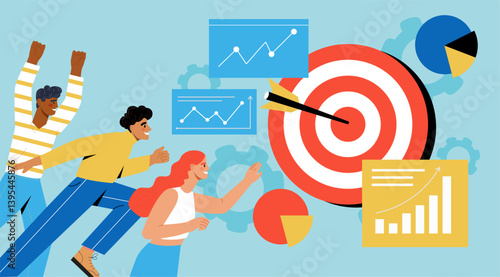 Business people connecting target pieces together, flat vector isometric illustration. Team work, collaboration, partnership.