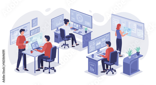 Business people harvesting dollar banknotes from money plant in pot, flat vector isometric illustration. Business investment profit, income, financial growth.