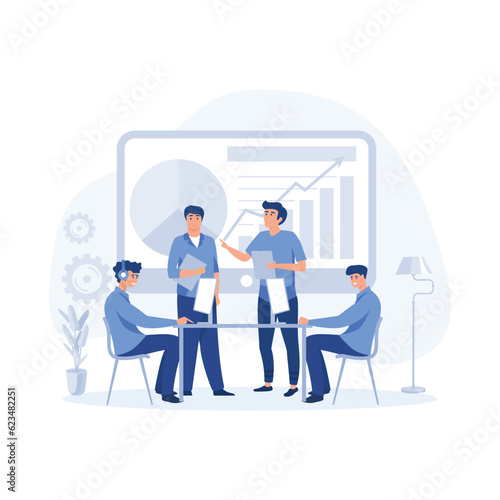 Business people in VR glasses touching virtual reality interface, flat vector illustration. VR education, simulation. Virtual reality technology.