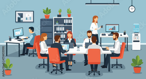 Vector illustration of business people in office, modern workspace and hallway interior with furniture. Flat style design.