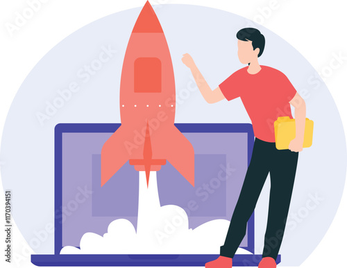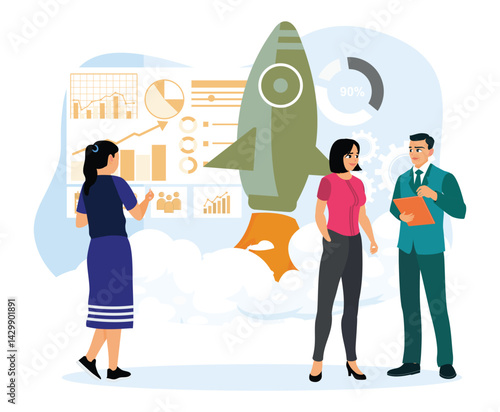 Business people looking at flying rocket, flat vector illustration. Space rocket launch, new business project startup concept.