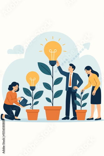 Business people with light bulb and money investing in new idea, project startup, flat vector illustration. Innovation idea development.
