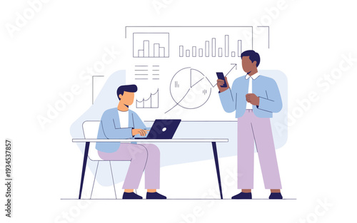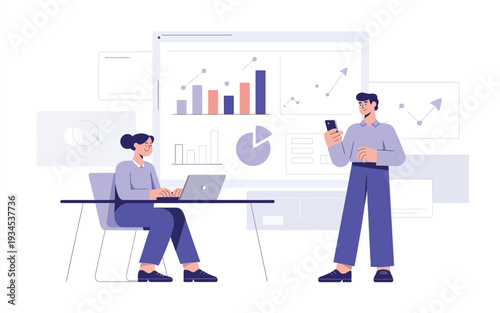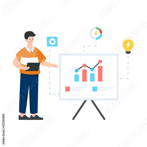 Business presentation, vector flat style design illustration. Young woman giving lecture, pointing at graphs on flip chart board. Business workshop, training concept for web banner, website page etc.