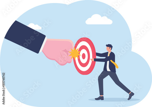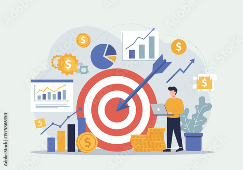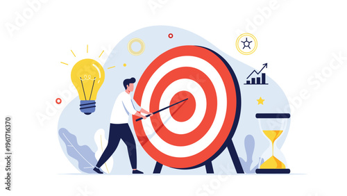 Business project startup rocket launch, flat vector illustration. Target, people with light bulb, money, riding rocket. Targeting, marketing, business idea creation, teamwork, financial investment