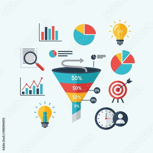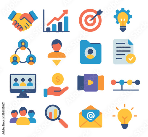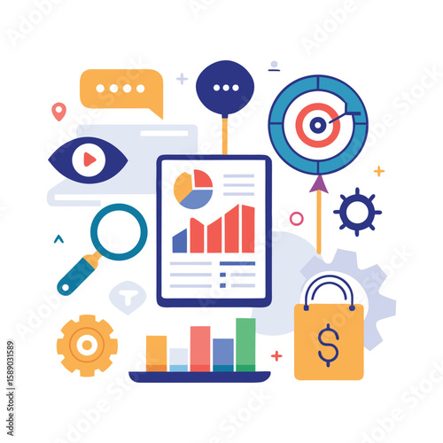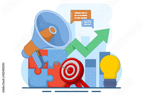 Business project startup vector 3d icon design illustration. Rocket shop, idea lightbulb, graph chart bar, arrow, message chat speech bubble, loupe, credit card, money symbol, target aim dartboard