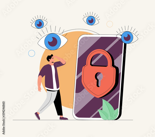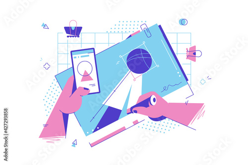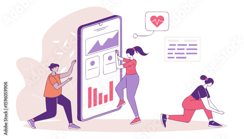 Huge human brain, business people micro male and female characters with light bulb, mobile phone, magnifier, vector illustration. Business startup, idea launching, brainstorm concept.