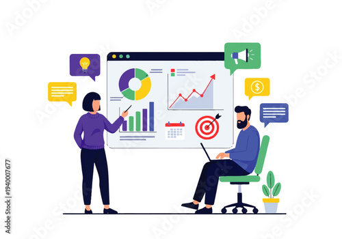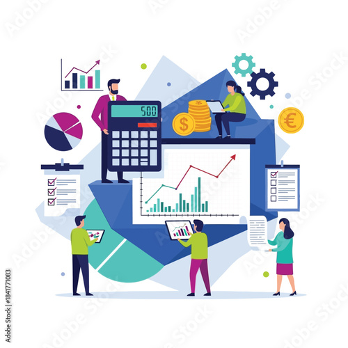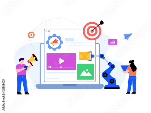 Diamond on huge computer monitor screen and micro male and female characters with wrench, screwdriver, mobile phone, laptop, vector illustration. Business startup concept for web banner, website page.