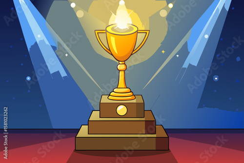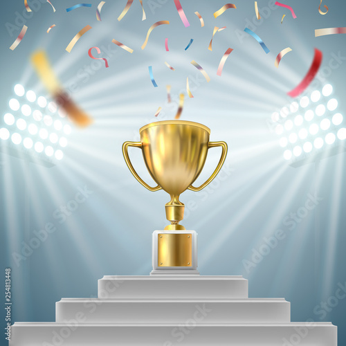 Business or sport competition winner poster web banner template. Vector illustration of white round podium with trophy award cup illuminated by floor spotlights.