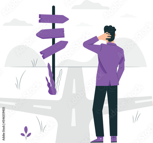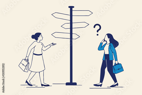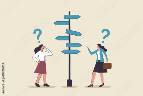 Vector illustration of two businessmen choosing the right path at guide post using map and gps. Business strategy concept flat style design.