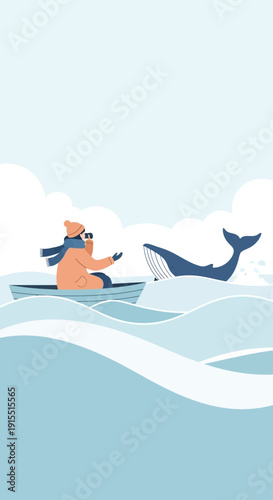Business success concept vector poster in paper art origami style. Businessman surfing on a top of the wave. Sea waves and clouds paper cut.