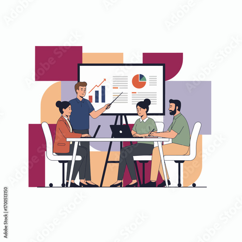 Business team working on city planning project, vector concept illustration. Online business conference, meeting, video conferencing, presentation, team work.