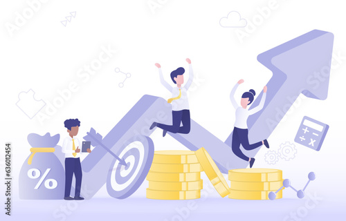Business woman climbing gold ingot staircase with flag on the top, flat vector illustration. Financial success, investing.
