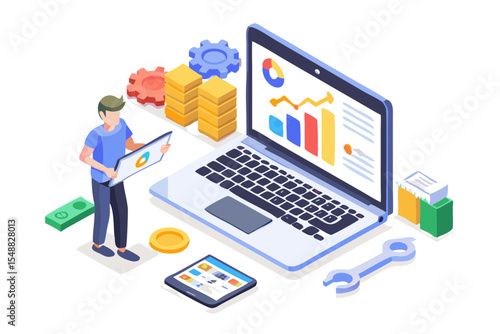 Business woman climbing up dollar coin staircase with flag on the top, flat vector isometric illustration. Financial success, career ladder.