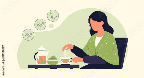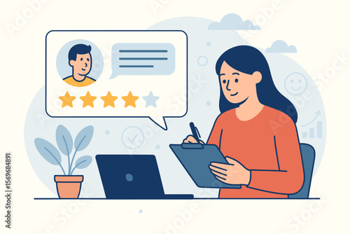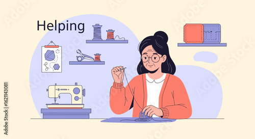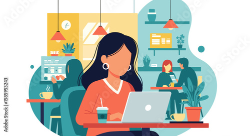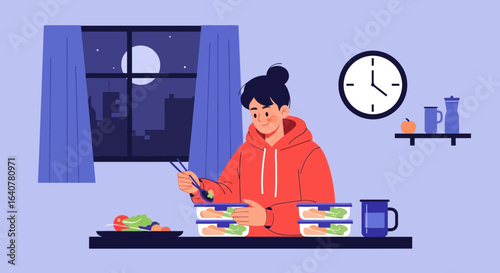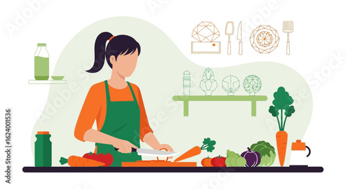 Business woman cooking and working on computer in kitchen, vector flat illustration. Busy multitasking woman holding tablet with charts on screen in one hand, baguette, dough rolling pin in the other.