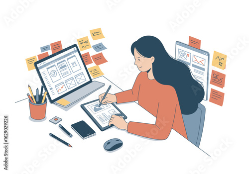 Business woman choosing path between office work, career and family standing at crossroads, flat vector isometric illustration. Decision making.