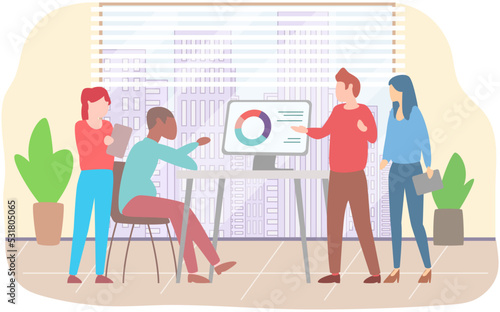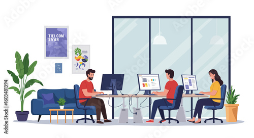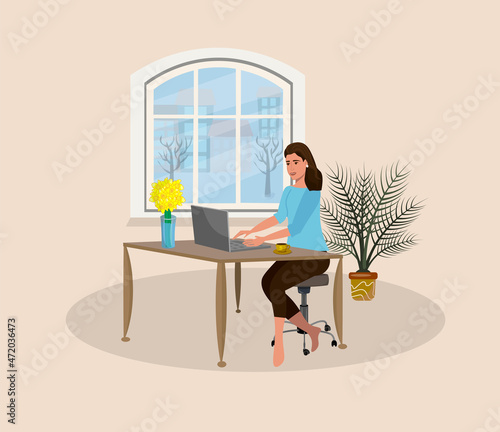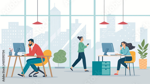 Business women work with laptops in office. Vector banner concept in flat style design. Office interior.
