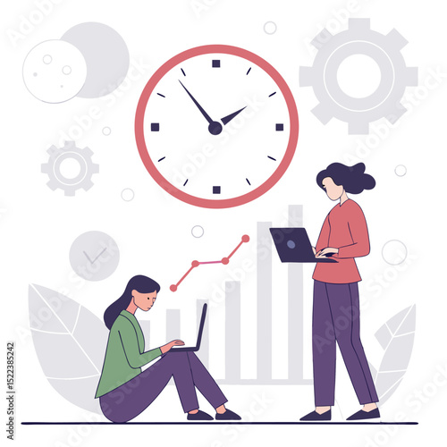 Businessman, employee with laptop standing next to huge clock, flat vector illustration. Online task management, planning schedule, self control.