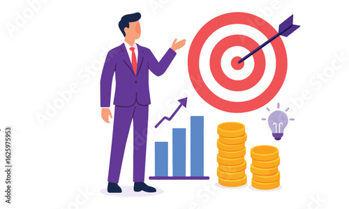 Businessman goal achievements, financial growth, flat vector isometric illustration. Horseshoe magnet target attracting gold coins.