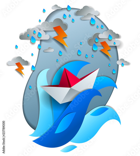 Businessman in boat on the top of ocean wave, vector illustration in paper art style. Business leader looking through telescope. Drowning in water paper boats. Business strategy, vision, success.