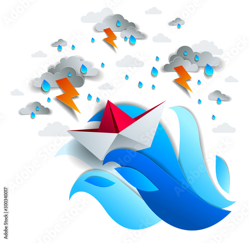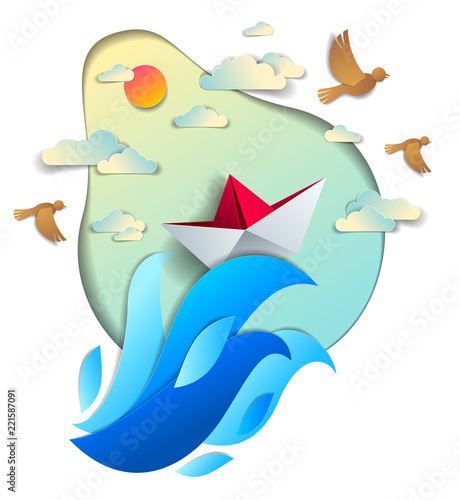 Businessman in boat on the top of ocean wave, vector illustration in paper art style. Business leader looking through telescope. Drowning in water paper boats. Business strategy, vision, success.
