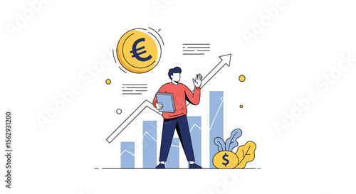 Vector illustration of businessman juggling gold coins with reserve currency symbols dollar euro pound etc. Business and finance concept design element.
