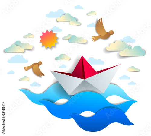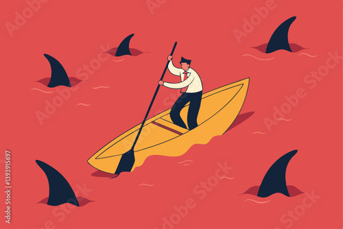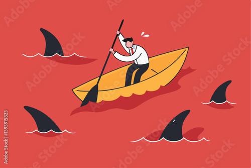 Businessman looking through spyglass on paper origami boat floating in sea with sharks. Business risk and search for opportunities concept