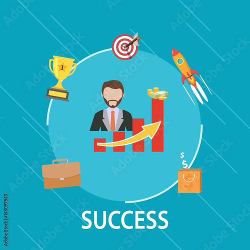 Business man looking through telescope standing on coin stack, flat vector illustration. Business leader, career growth, future vision, financial success.
