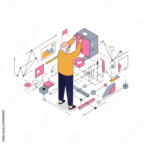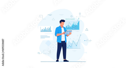 Business man looking through telescope standing on coin stack, flat vector illustration. Business leader, career growth, future vision, financial success.