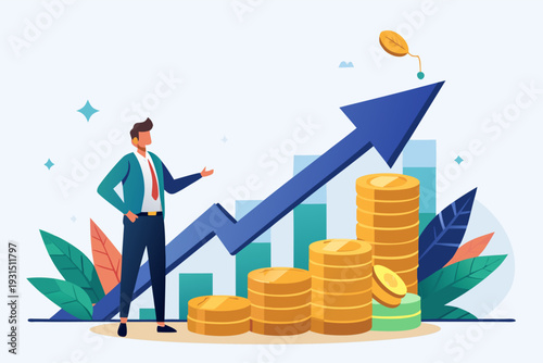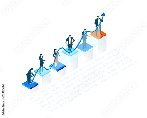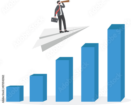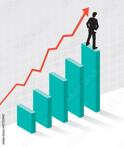 Businessman standing on the top of revenue growth increasing graph, flat vector isometric illustration. Sales increases, income, profit growth.