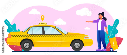 Businessman with briefcase trying to catch yellow taxi cab, flat vector illustration. Young man running to get taxi car during rush hours. Office worker is late for work.