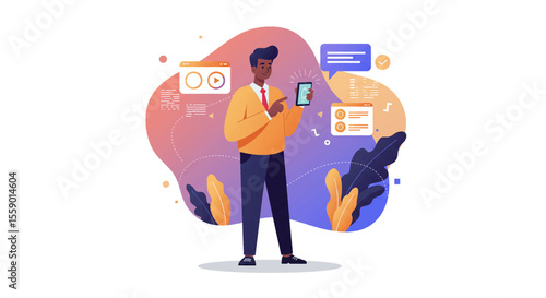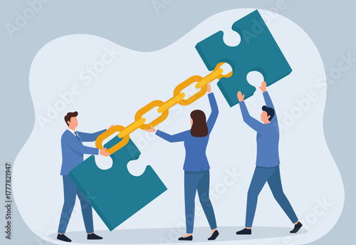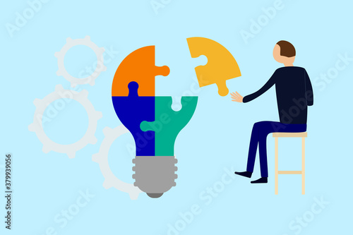 Vector illustration of two businessmen collecting puzzle of electric light bulb. Creating ideas and teamwork concept design element.