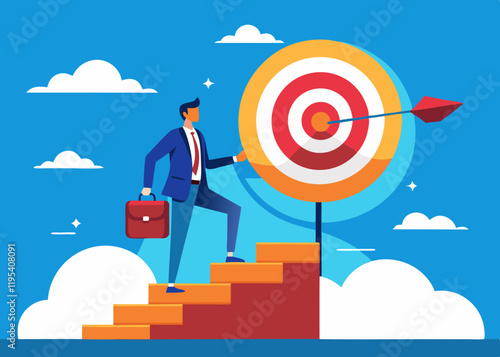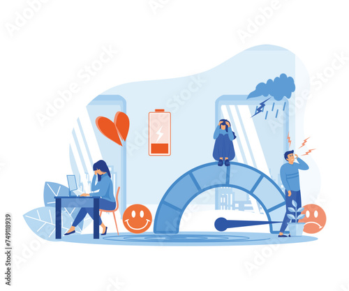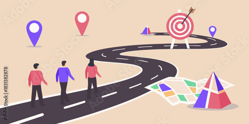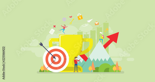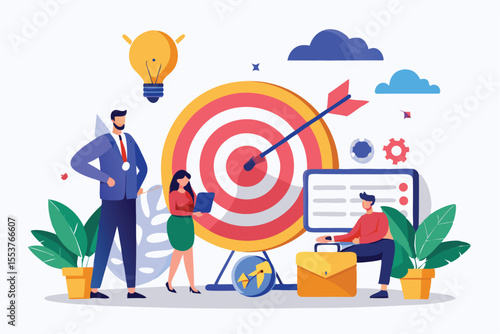 Busy employees doing tasks, holding pie chart, megaphone, target, calendar, flat vector illustration. Office people engaged in work. Efficiency, productivity, task management.