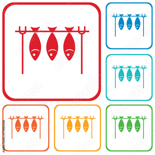 Butchery showcase with hanged meat, ham and sausages vector icon isolated on white background