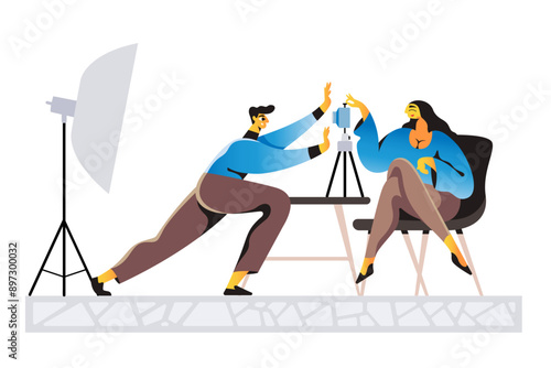 Cafe concept vector flat style design illustration. Big serving platter with dome lid and tiny characters visitors and waitress. Restaurant, catering business.