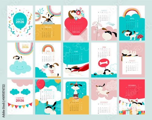 2019 yearly calendar vector template with sunday-saturday format and cute cats design.