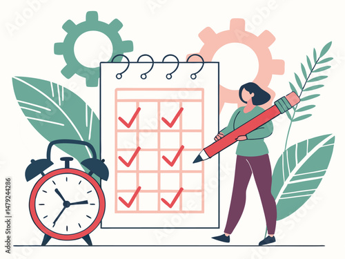 Huge calendar with stickers, check marks and micro characters scheduling, planning work, vector flat style design illustration. Calendar planner, event schedule concept.