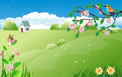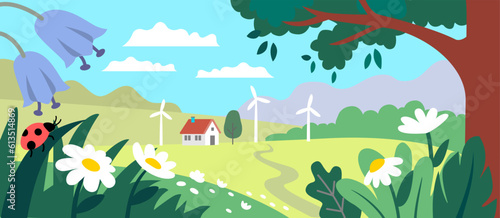 Summer camp in mountain valley at river bank vector illustration. Happy people tourists living in tents, travel trailers and camper vans, cooking and eating food outdoor, playing, talking each other
