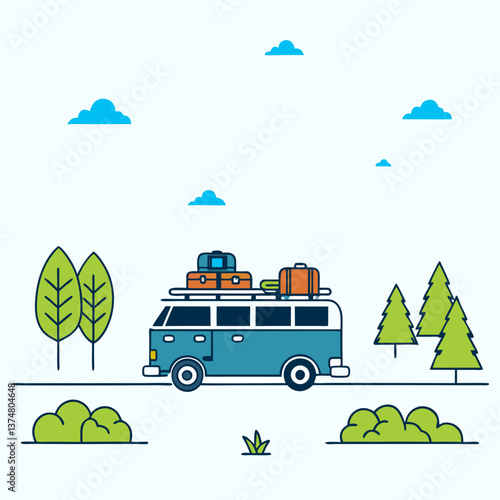 Camper van with bicycle on a roof. Travel and camping isometric vector illustration in flat 3d style. Outdoor camp activity. Travel by caravan car.