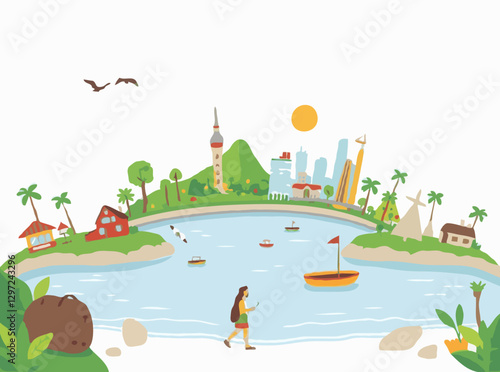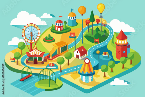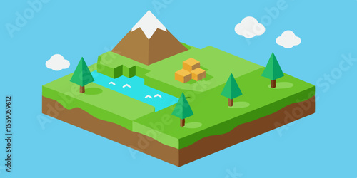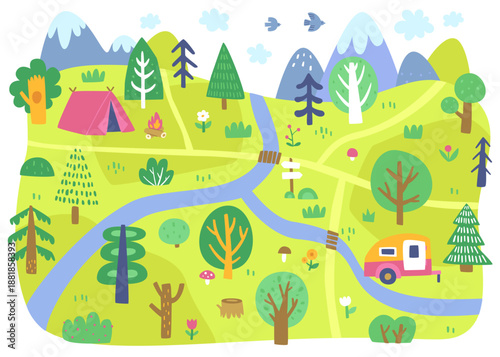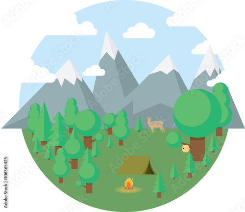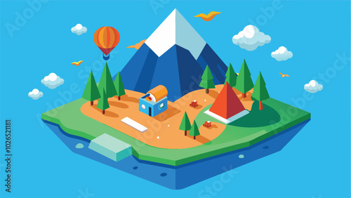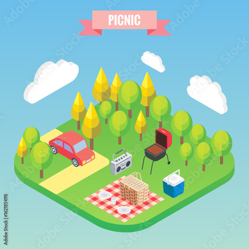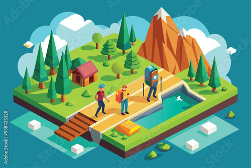 Camping isometric concept. Vector illustration in flat 3d style. Outdoor camp activity. Travel in mountains.