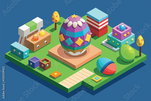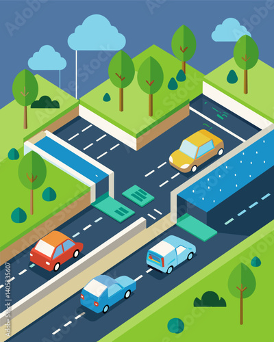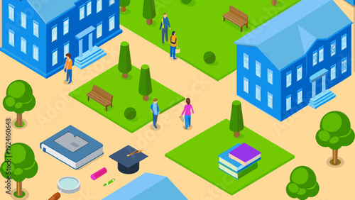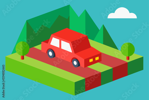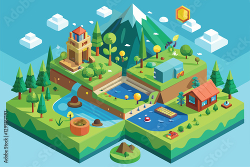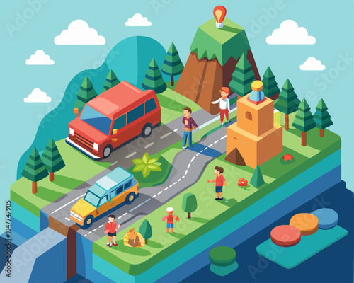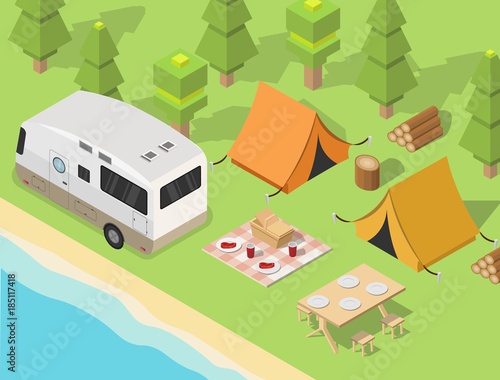 Camping isometric concept. Vector illustration in flat 3d style. Outdoor camp activity. Travel by camper in mountains.