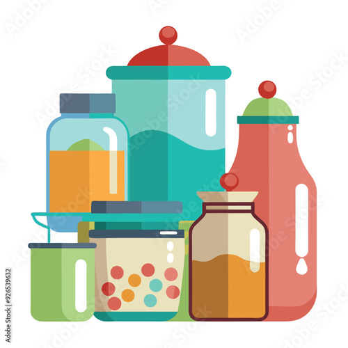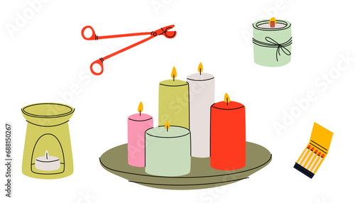 Travel vector set. Camping kitchenware and touristic supplies illustration. Cooking kettle and spices, thermo cup, flask, gas burner, mug and plate, axe and matches picnic equipment isolated on white