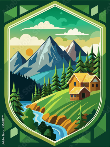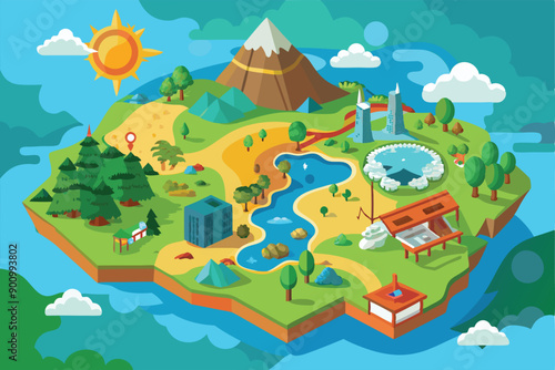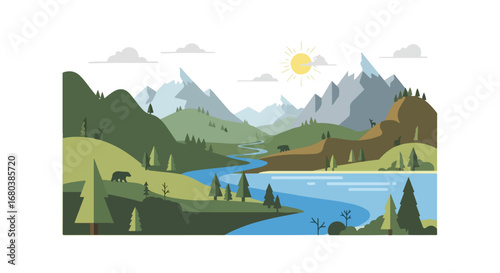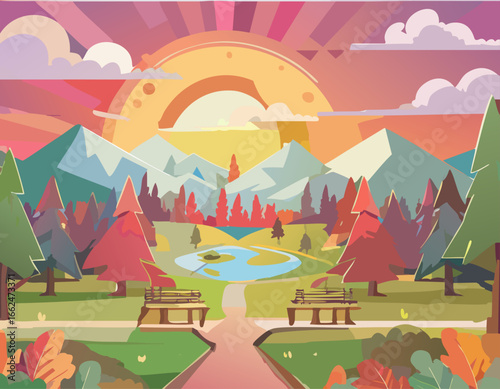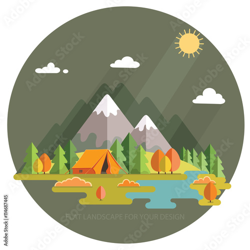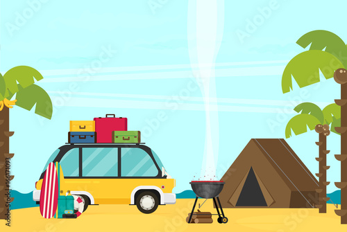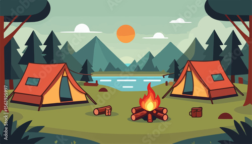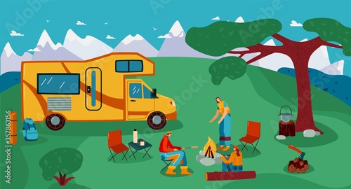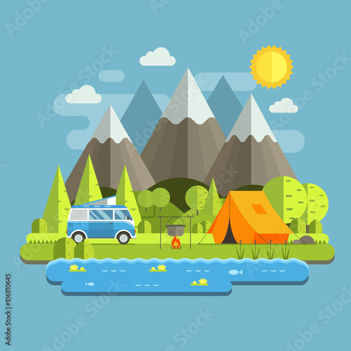 Camping site with tent, bonfire and camper van with mountain and lake landscape on background. Summer camp vacation vector illustration. Adventure, nature, campfire.