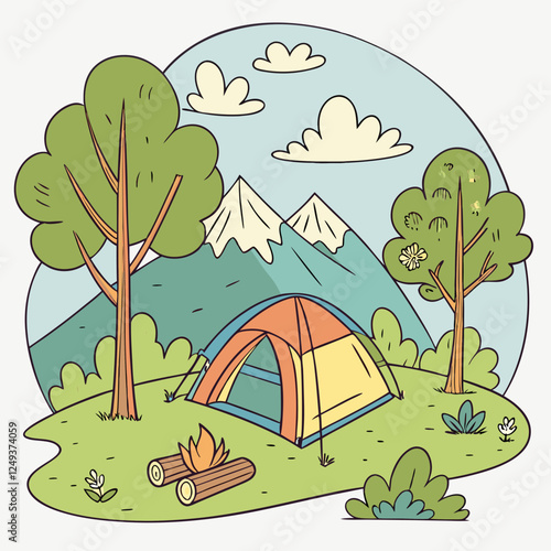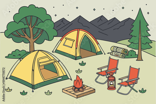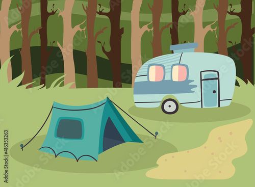 Camping site with tent, bonfire and camper van. Summer camp vacation vector illustration. Forest landscape with camping equipment. Adventure, nature, campfire.